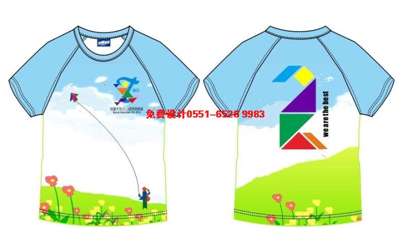 這款班服2班的,采用淡藍色的圓領T恤,前面印彩色的班級班徽,后面印不規則的圖案組成的彩色阿拉伯數字2。