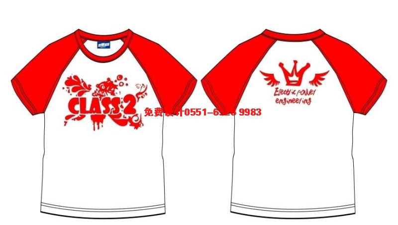紅色插肩袖班服,前面整體看上去是一大片鮮花,中間印上CLASS 2.后面是皇冠加翅膀。圖案也是紅色的,和衣服色調比較配。