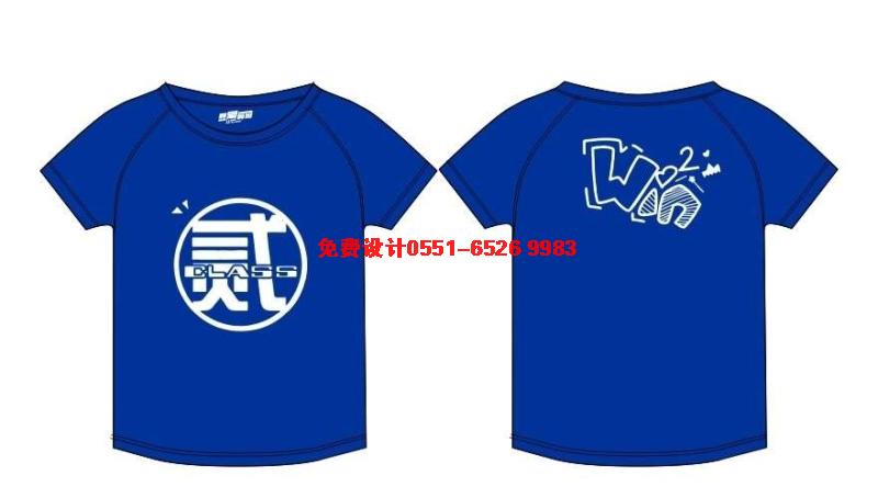 藍(lán)色圓領(lǐng)2班班服,底衫采用藍(lán)色T恤衫,前面印圓圈大寫的貳,CLASS,后面印刷白色的WIN2