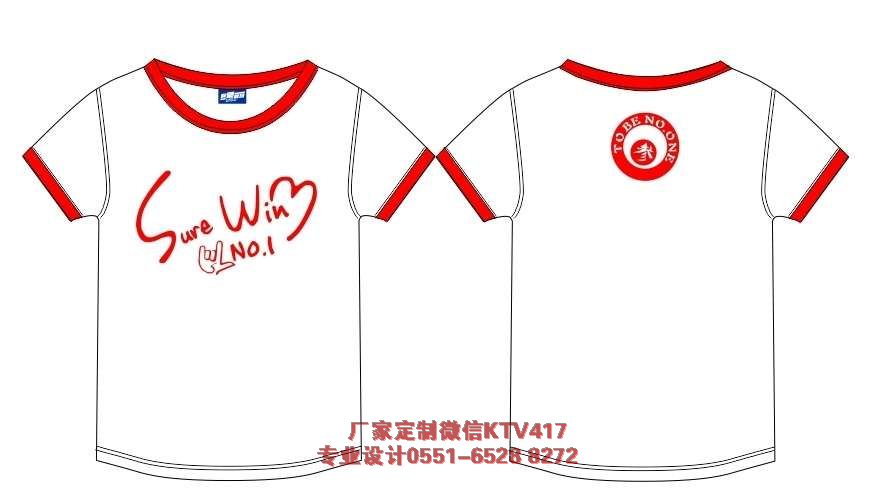 三班統一服裝圖案設計,這款三班班服圖案采用的是鑲邊圓領文化衫,前面印刷圖案為:SURE WIN3 NO.1后面是紅色的三班班徽