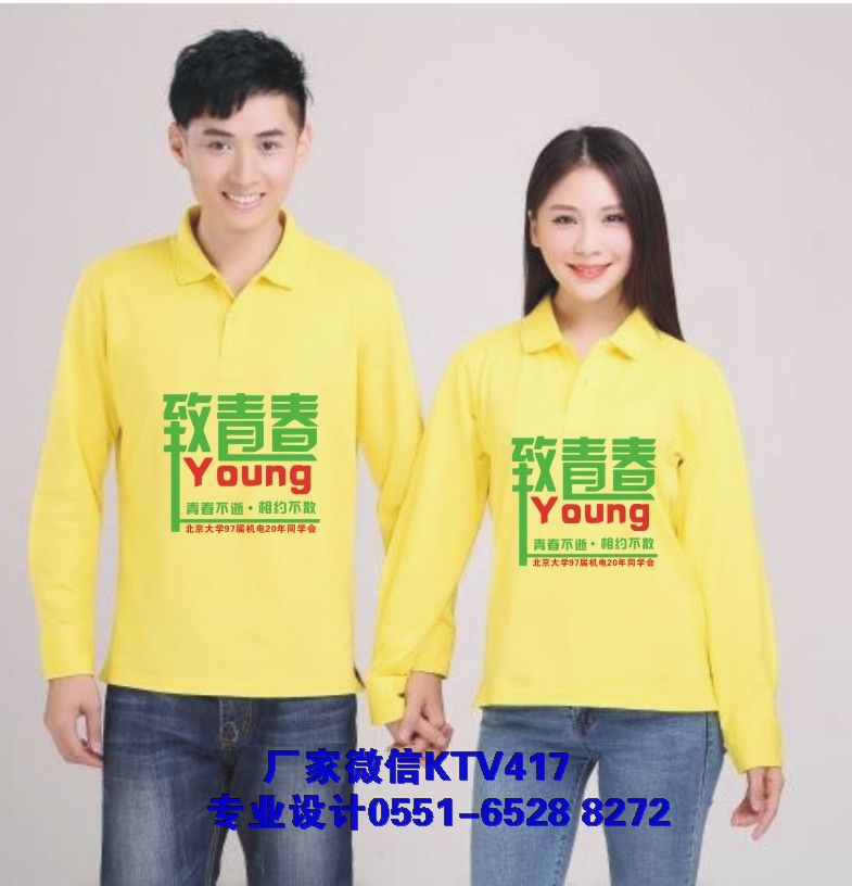 畢業(yè)聚會致青春紀(jì)念衫,采用的是黃色的翻領(lǐng)長袖T恤衫,前面印刷致青春,YOUNG,其中致青春為綠色印刷。青春不逝,相約不散。