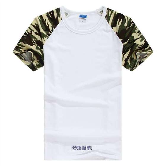 白色底衫,藍色迷彩拼色插肩袖文化衫,這款也有3個顏色的迷彩顏色。