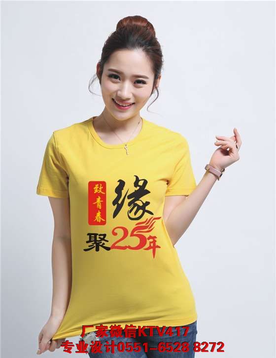 該款圖案采用黃色的圓領純棉T恤衫,前面印刷上紅色的致青春,25年,聚,緣。圖案視覺效果佳。