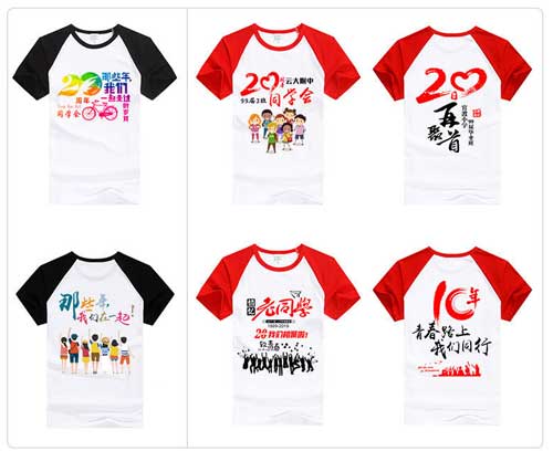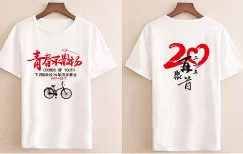 是印大字還是印小字?印單色字還是印彩色字?是T恤衫前面印字還是后面印字?夢瑤服裝廠設計,生產同學會T恤衫超過15年,設計和生產經驗豐富,下面就給同學們說說同學聚會T恤印字內容。