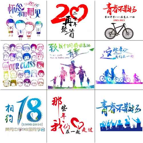 印字的衣服統一了同學們的服裝,傳統上同學聚會衣服顏色白色和紅色,也有不少同學們做綠色和藍色的,綠色的衣服印字顏色為紅色,藍色衣服印字為白色。同學會衣服圖案大全