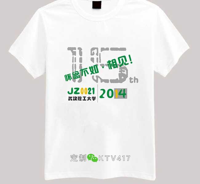 這款同學聚會文化衫文字設計的很清爽,主題色調為黃色和綠色,給人一種清爽的感覺。聚會數字:15TH采用灰色印刷,要是用黑色的話,就太突出了,不朦朧了。懷念不如相見!采用的是綠色粗體設計,后面是感嘆號!意思是想念你就見唄!大膽一點,來一場同學們的聚會。一見解百思。